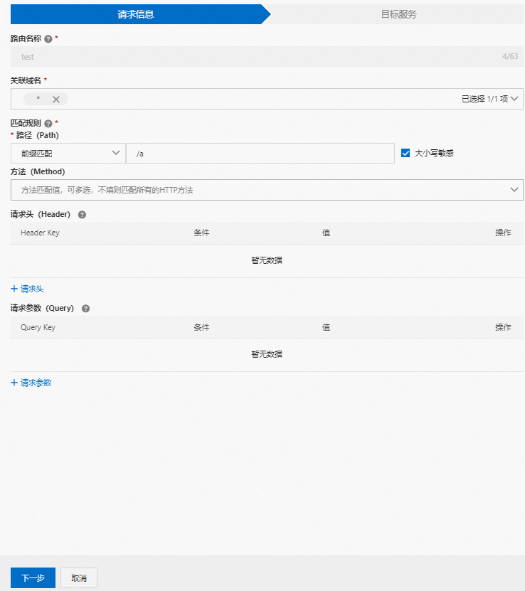 在请求信息页面,配置路由名称和关联域名,匹配规则选择前缀匹配,其他配置选择默认即可。